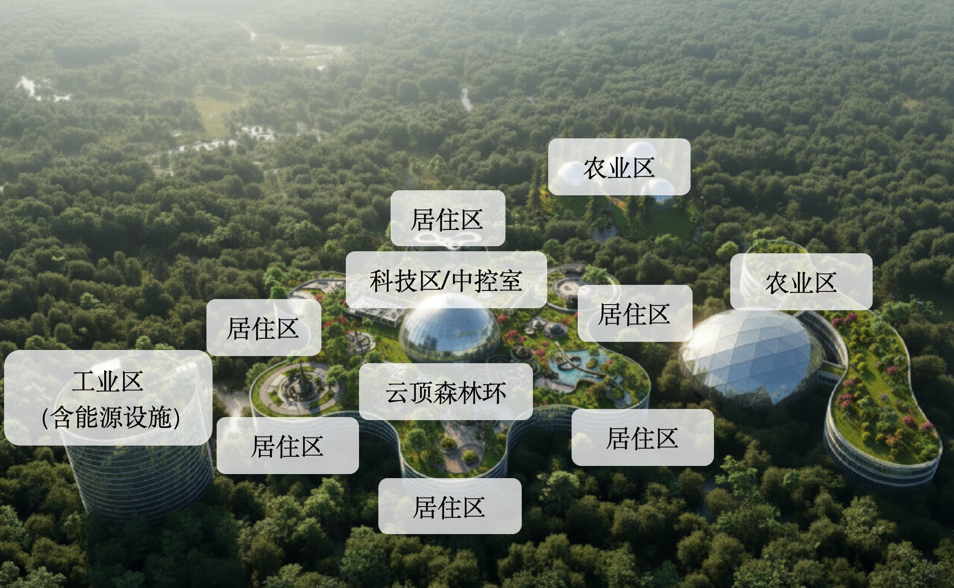 为了避免重蹈旧地球资源枯竭、环境恶化从而脱离现实世界之覆辙,我们将以一套完整的系统架构支撑起一个新的小世界,从而实现“融于自然”的建设目标。