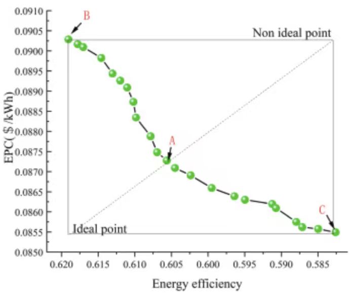 将实验得到的数据带入上述公式,得到优化后的二维帕累托边界如下所示。其中的所有点构成了计算得到的最优解集。从图中可以观察到,随着系统效率的提高,EPC呈现逐渐上升的趋势,在点A处,系统效率达到约60.56%时,EPC表现出更快的增长趋势。从图11可以看出,点B具有最高的系统效率和单位发电成本,分别为61.91%和0.09029美元/kWh,该分析表明点B展示了最高的热性能。