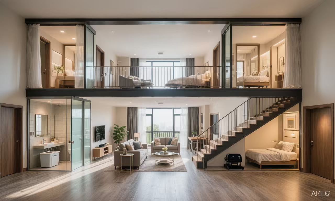 无人居住(冗余设计):5间loft,5间普通五口住房,25间双人间/三人间,50间单人间,总计
