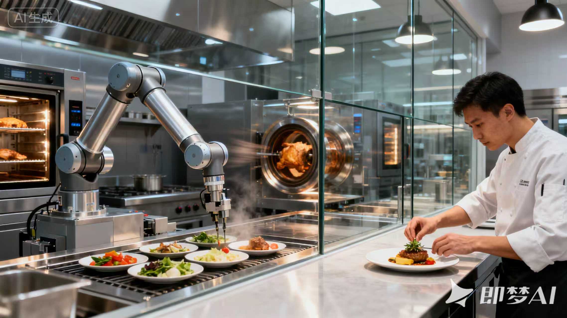 中央厨房:总面积为2500平米、双层设计,层高为4米,一层设计单次就餐人数为800人,极限为1200人,一层后厨采用全机器化生产模式保障供应充足;二层为自助餐厅加多人包厢设计,采用预约制,部分菜品为人工厨师现烧。两层总体积为2w立方。采用304L不锈钢兼磁吸餐具,便于机器一体化回收清洁。