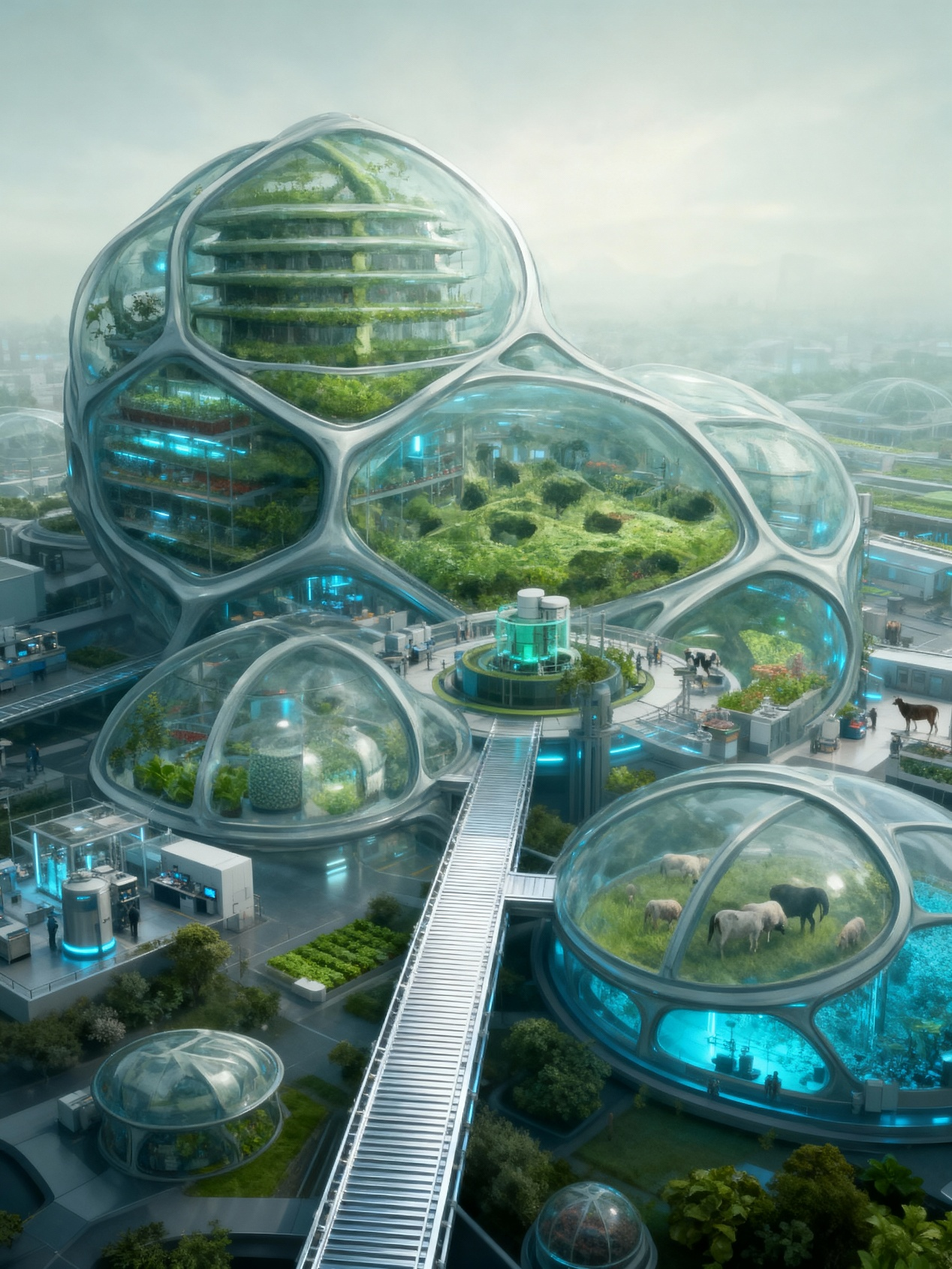 可重构内部空间: 农业区内部可以根据生产需要,由材料“自动形成新的隔断、攀爬架、灌溉渠道或收割通道”。作物布局不再是固定的,而是可以像液体一样“按需流动和重组”。